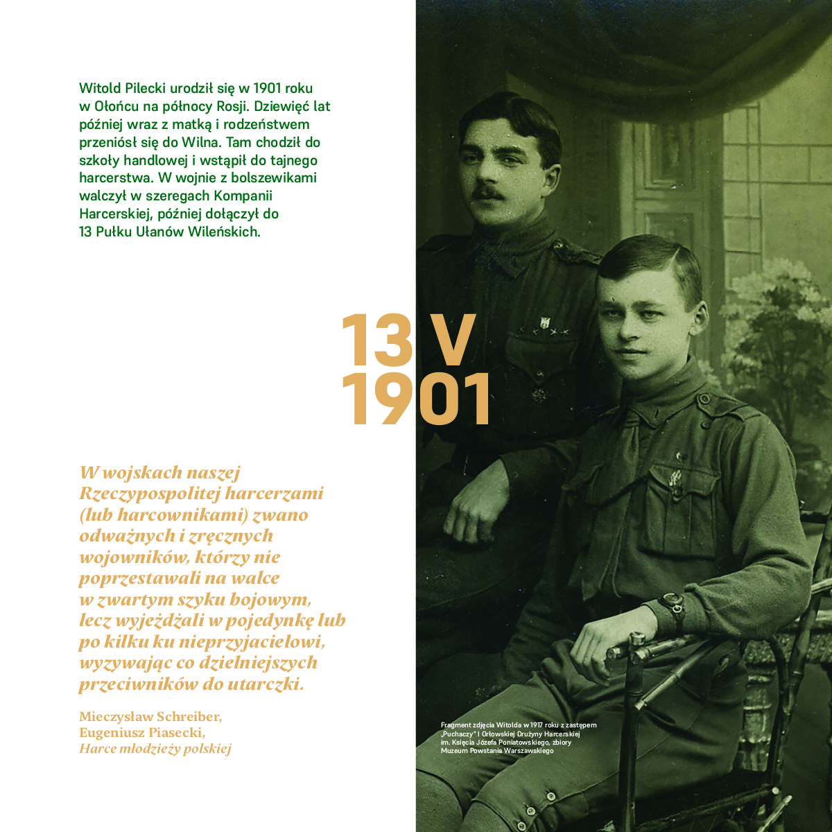 Pilecki w heroiczny sposób służył Polsce, najpierw walcząc w wojnie polsko-bolszewickiej, potem dobrowolnie dostając się do Auschwitz, aby informować o niemieckich zbrodniach. Po ucieczce z obozu walczył w Powstaniu Warszawskim, a po wojnie działał przeciwko reżimowi komunistycznemu.