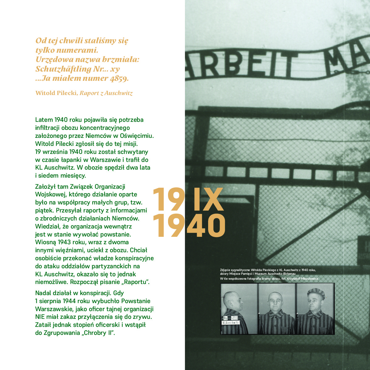 Witold Pilecki dobrowolnie dał się aresztować przez Niemców, aby trafić do Auschwitz i zorganizować tam ruch oporu oraz przekazywać informacje o funkcjonowaniu obozu.